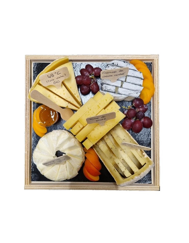 Découvrez un assortiment pour 6/8 personnes de fromages locaux au lait cru, présentés sur un plateau, étiquettes avec désignation des fromages et quelques fruits frais ou secs selon les saisons.